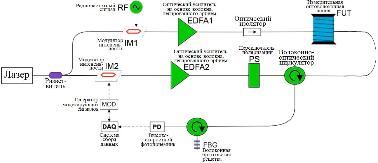 На рисунке 2 показана общая схема измерений методом BOTDA или методом BOFDA. Излучение лазера CoBrite DX1 с рабочей длиной волны 1550 нм (производства компании ID Photonics, Нойбиберг, Германия) разделяется древовидным оптическим разветвителем (сплиттером Y- или Т-типа) с коэффициентом деления оптического сигнала 50/50. В нижней ветви свет модулируется с помощью электрооптического модулятора интенсивности IM2 с получением либо импульсной, либо синусоидальной модуляции в зависимости от типа проводимых измерений (BOTDA или BOFDA соответственно). Последующий сигнал накачки усиливается, проходя через оптический усилитель на основе волокна, легированного эрбием, EDFA2 (Erbium Doped Fibre Amplifier 2), затем переключается его поляризация в переключателе поляризации (PS, polarization switch) и, наконец, через волоконно-оптический циркулятор он входит в измерительную оптоволоконную линию в зоне мониторинга (FUT, Fiber Under Test) с одного конца. Переключатель поляризации (PS) попеременно поворачивает плоскость поляризации волны накачки на 90 град., чтобы реализовать схему поляризационного разнесения каналов [9]. В верхней ветви (см. рис. 2) генерируется зондирующая волна посредством двухполосной модуляции с подавленной несущей частотой (DSB SC, Double-SideBand Suppressed-Carrier modulation). На практике модулятор интенсивности оптического излучения IM1 имеет смещение в минимальной точке передачи мощности, так что радиочастотный (RF, RadioFrequency) сигнал, подаваемый микроволновым генератором SynthHD производства компании Windfreak Technologies (Порт-Ричи, Флорида, США), генерирует две боковых полосы в спектре зондирующей волны с разницей между частотой каждой из них и частотой лазерного излучения, соответствующей радиочастоте. Затем зондирующая волна усиливается, проходя через оптический усилитель на основе волокна, легированного эрбием, EDFA1 (Erbium Doped Fibre Amplifier 1), проходит через оптический изолятор и входит в измерительную оптоволоконную линию в зоне мониторинга (FUT, Fiber Under Test) с другого конца. Отраженное в месте измерений излучение направляется через волоконнно-оптический циркулятор к узкополосной (около 0,04 нм) волоконной брэгговской решетке (FBG), которая «выбирает» (отражает) боковую полосу с более низкой частотой (стоксову компоненту) и в то же время отфильтровывает (пропускает) усиленный шум, обусловленный спонтанным излучением EDFA1. Наконец световой сигнал преобразуется в электрический с помощью высокоскоростного фотоприемника (PD, PhotoDetector, photoreceiver) модели 1544-B производства компании Newport Corporation (Ирвин, Калифорния, США), соединенного с системой сбора данных (DAQ, Data Acquisition System), включающей аналого-цифровой преобразователь FMC104 производства компании Abaco Systems (Хантсвилл, Алабама, США) или векторный анализатор цепей M9374A производства компании Keysight (Санта-Роза, Калифорния, США) для измерений методами BOTDA или BOFDA соответственно.