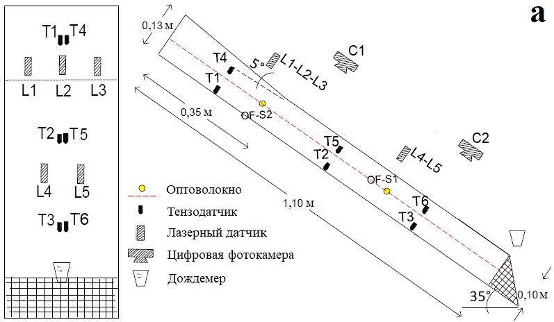 Во время испытания для контроля поведения искусственного склона применялись и другие устройства: 6 миниатюрных тензометров (Т1–T6), установленных в трех поперечных сечениях на глубине 5 см и в подошве грунта на глубине 10 см для измерения матричного всасывания (см. рис. 3, а), а также 5 лазерных датчиков (L1–L5), установленных над поверхностью грунта для мониторинга его осадок. Кроме того, использовались 2 цифровые фотокамеры (C1, C2) для получения с помощью велосиметрии по изображениям частиц (PIV, Particle Image Velocimetry) полей смещений и скоростей поверхности грунта. Эти 2 камеры, установленные на высоте 1 м над поверхностью грунта, позволяли снимать участок шириной 50 см и длиной 100 см. Вид в плане и поперечное сечение рассматриваемой физической модели склона, оснащенной измерительными инструментами, схематично показаны на рисунке 3.