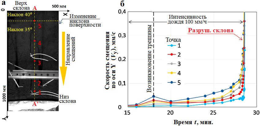 Деформирование склона также анализировалось с помощью фотокамер и распределенного волоконно-оптического датчика. Прогрессирующее деформирование слагавшего его грунта было выявлено по скоростям смещений вдоль линии А-А’ (рис. 5) и с помощью велосиметрии по изображениям частиц (PIV): самая верхняя часть склона, где наклон был выше (точка 5 на рисунке 5), начала перемещаться раньше с большей скоростью, чем самая нижняя часть. И процесс деформирования характеризовался более высокой скоростью в верхней части склона в течение всего эксперимента. Поскольку подножие склона была зафиксировано, наименьшие скорости смещений были в точке 1 (см. рис. 5).