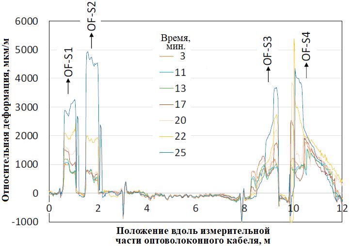 Рис. 6. Деформации вдоль измерительного волоконно-оптического кабеля по всей его длине. Участки S1–S4 соответствуют линейным участкам оптоволоконного кабеля, встроенным в грунт, слагающий искусственный склон (OF-S1 и OF-S2 – поперек склона; OF-S3 и OF-S4 – вдоль склона, см. рис. 3, б)