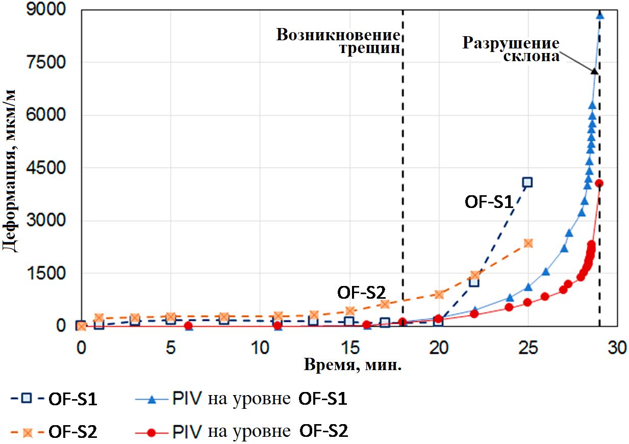 Наконец, на рисунке 7 сопоставлены деформации, измеренные с помощью поперечных линейных участков распределенного волоконно-оптического датчика (OF-S1 и OF-S2) и полученные путем велосиметрии по изображениям частиц (PIV) с использованием цифровых фотокамер. Деформации, определенные этими двумя методами, хорошо согласовывались во время первой части эксперимента, но после образования первой трещины растяжения только волоконно-оптический датчик показал, что деформации значительно увеличились примерно за 10 мин. до разрушения склона. Более того, оптоволоконный участок OF-S2, расположенный близко к области возникновения трещин растяжения, смог обнаружить деформирование грунта, превышавшее выявленное методом PIV в том же месте (см. сечение 2 на рисунке 7) и в более раннее время (примерно через 4 мин. после начала эксперимента): за 1 мин. до возникновения трещин на поверхности оптоволоконный участок OF-S2 зафиксировал относительную деформацию грунта около 630 мкм/м, тогда как методом PIV была выявлена деформация менее 100 мкм/м. Это указывает на то, что распределенный волоконно-оптический датчик можно эффективно использовать не только для оценки поля деформаций склона в процессе инфильтрации дождевой воды, но и для своевременного обнаружения предвестников приближающегося разрушения.