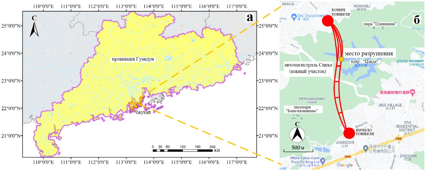 Рис. 1. Расположение обрушившегося тоннеля «Шицзиншань» в городе Чжухай (провинция Гуандун, Китай): a – гидрологическая система провинции Гуандун; б – расположение тоннеля и места его разрушения, произошедшего 15 июля 2021 года, на карте (источник картографической основы: Google Maps)