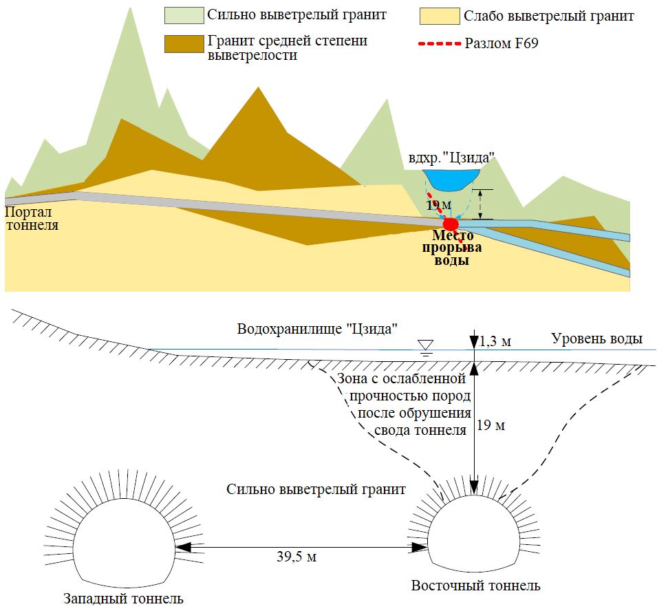 Катастрофический прорыв воды произошел 15 июля 2021 года в 3:30 в результате обрушения свода восточного тоннеля. До этого, 14 июля в 18:55, при проходке данного тоннеля были завершены буровзрывные работы. Последующая очистка забоя от взорванной породы продолжалась около 9 часов и была окончена 15 июля в 2:35. Однако помимо опережающей трубной крепи без инъектирования какие-либо другие элементы крепления не были установлены. И в 3:28 произошло обрушение значительного количества песка и камня со свода восточного тоннеля. А спустя 2 минуты участок свода, не имеющий крепления, обрушился полностью, после чего в тоннель хлынула вода. Затем вода устремилась в западный тоннель через соединительный ход. На рисунке 2 показан уровень воды в тоннеле после прорыва. В западном тоннеле на расстоянии 1160 м от портала оказались заблокированными 14 человек (см. рис. 2).