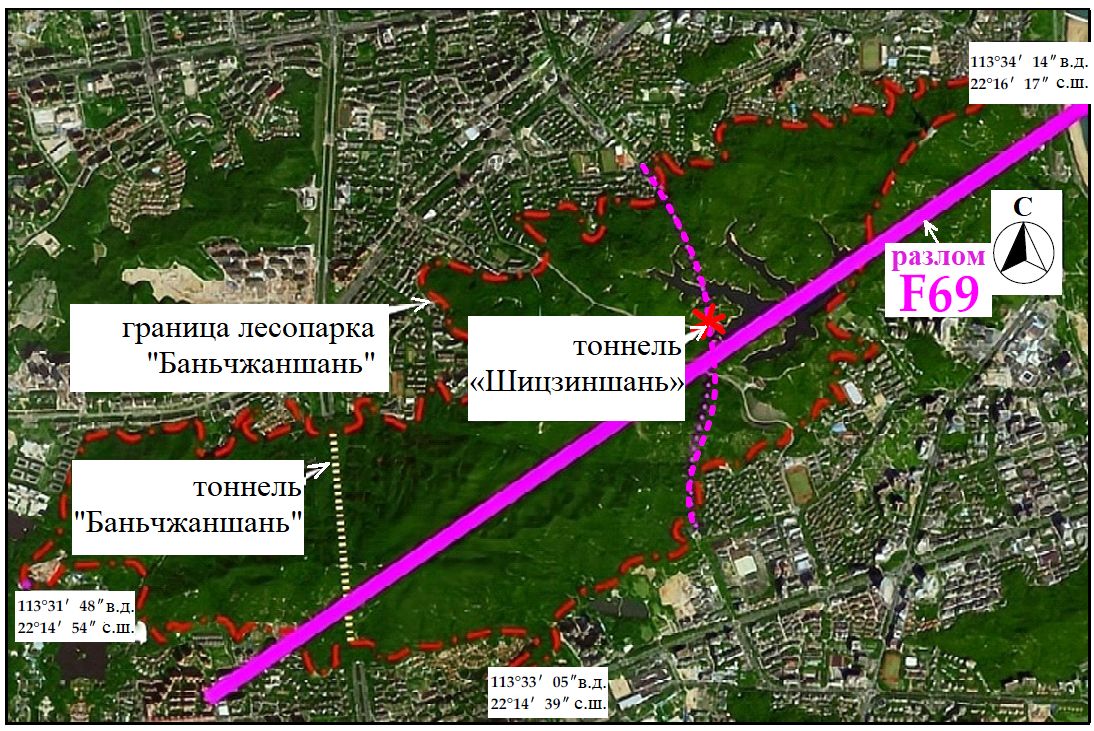 При инженерно-геологических изысканиях, выполненных для строительства другого тоннеля под горой Баньчжаншань, носящего то же название, что и гора, было выявлено наличие разлома, пересекающего горы Баньчжан, под названием F69 (согласно геологической карте города Чжухай) (см. рис. 8). Этот разлом простирается в направлении с юго-запада на северо-восток. Была высока вероятность пересечения проектируемой трассой тоннеля «Шицзиншань» с F69 в месте, расположенном под водохранилищем «Цзида». В случае подтверждения этой оценки данное место было бы наиболее опасным участком тоннеля.