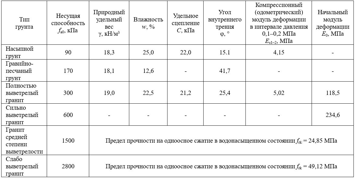 Инженерно-геологический разрез в указанном месте сложен насыпным грунтом (занимающим верхнюю часть и имеющим мощность около 2–6 м), гравийно-песчаным грунтом, полностью выветрелым гранитом, сильно выветрелым гранитом, гранитом средней степени выветрелости и слабо выветрелым гранитом. Оцененные значения геотехнических параметров для этих слоев приведены в таблице.