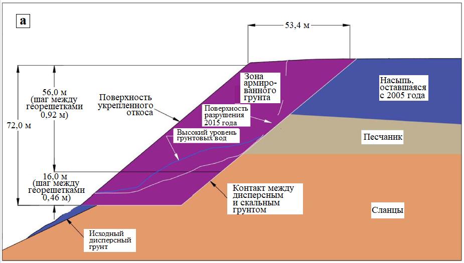 Несмотря на то что расположение «поверхности 1» соответствовало местоположению трещины закола, обнаруженной в 2013 году, фактическое разрушение произошло в 28 м от бровки откоса, что означает, что поверхность разрушения прошла сквозь верхние слои армогрунтовой зоны по «поверхности 2» (см. рис. 3).