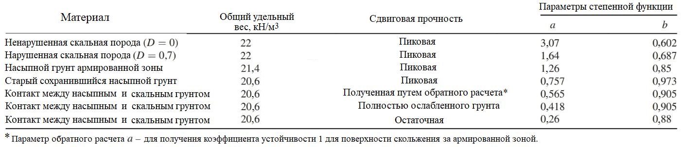 После случившегося катастрофического события был проведен двумерный анализ предельного равновесия (LEM) для оценки устойчивости армогрунтовой зоны склона как на момент завершения строительства в 2006 году, так и на момент ее разрушения в 2015 году. Исходные данные были получены при строительстве и при испытаниях образцов, отобранных после аварии. Параметры, использованные для анализа, приведены в таблице.