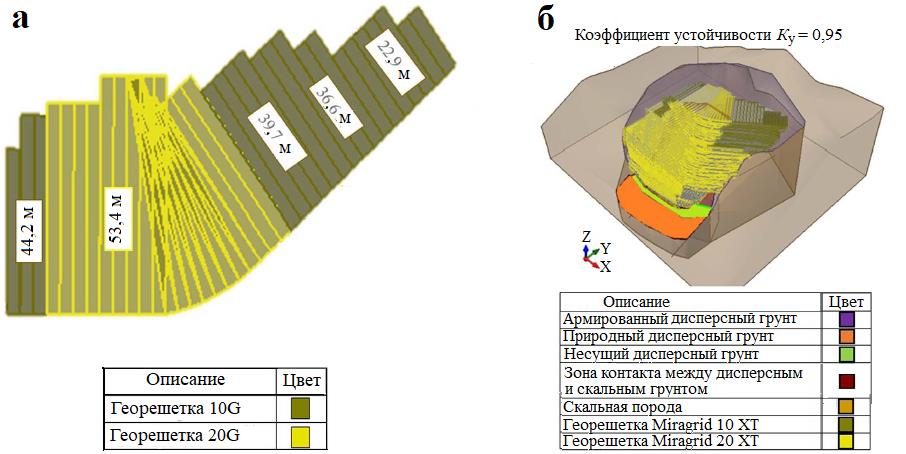 Рис. 4. Схема компоновки двух типов георешеток (10G и 20G) для строительства на высоте 281,5 м (а) и результаты моделирования в программе Slide3 для рассматриваемого склона в момент разрушения (при пределе прочности анизотропных георешеток на разрыв при растяжении) в условиях высокого уровня грунтовых вод (б) (по [1])