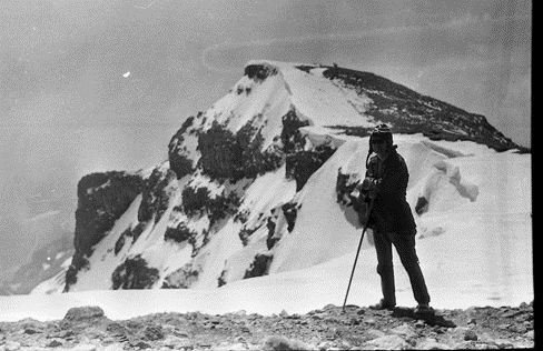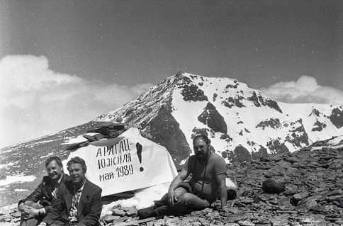 В 9.10 прошли метеостанцию. Пологий подъём по снежнику. Наст плотный, не проваливается. Иду в кедах, спортивном шерстяном костюме, поверх – джинсы, куртка «Сессон» и кожаная куртка, на голове – «шапка монтажника» (подшлемник), в руках фотоаппарат и палка. Внимательно слежу за своим состоянием. В 9.30 увидели зайца на снегу, который быстро скрылся за гребнем. Погода стоит отменная: тихо, солнечно. Снег за ночь промёрз. В 9.45 я разделся, остался в джинсах, рубашке и кожаной куртке, остальное обвязал вокруг пояса. Надел чёрные очки, чтобы не болели глаза. Очень тихо в горах на высоте. Переговариваемся на расстоянии до 200 м. В 11.30 отстал наш курильщик Л.Б. Баранников, а мы увидели домик на гребне. В 12.00 подошли к южной вершине, предприняли попытку выхода на западную вершину, но пройти к ней мешало ущелье глубиной до 150 м, решили, что это на 3 часа ходу и не пошли. Фотографируемся (рис. 1, 2), забираем в «туре» (сложенный из камней конус) записку предыдущих посетителей, кладём свою, и без 5 час начинаем обратный спуск, через час мы у машины.