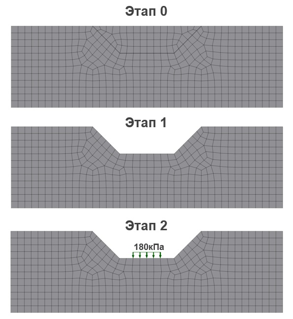 Для определения влияния сжимаемой толщи в плоской постановке был замоделирован ленточный фундамент шириной 2 м, глубиной залегания — 2 м, с нагрузкой по подошве в 180 кПа, ширина нижнего основания котлована — 4 м, характеристики грунта представлены на рисунке 1, а реализованные в midas GTS NX стадии — на рисунке 2: этап 0 — начальная стадия, этап 1 — откопка котлована и этап 2 — активация нагрузки.