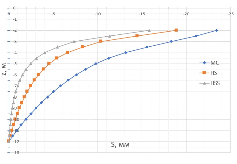 На рисунке 6 представлено распределение осадки по глубине для разных моделей грунта. По этому графику видно, что для MC величина осадки по глубине близка к линейному распределению, что осадка с глубиной затухает значительно меньше, чем для моделей HS и HSS. Данные графики были получены с помощью инструмента «Cutting Diagram»: диаграмма была проведена от центра фундамента до нижней границы модели, а далее данные диаграммы были извлечены и уже средствами Excel были сформированы графики, показанные на рисунке 7.