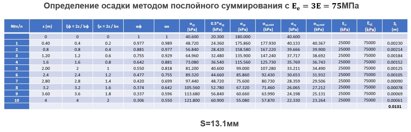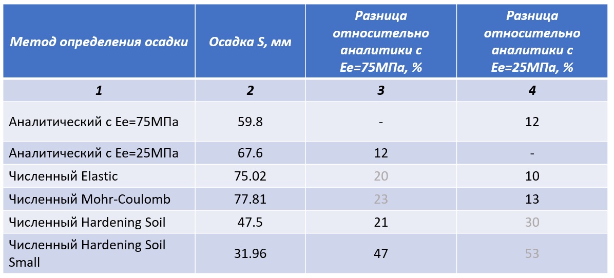 Рис. 14. Сравнительная таблица расчета осадки разными методами