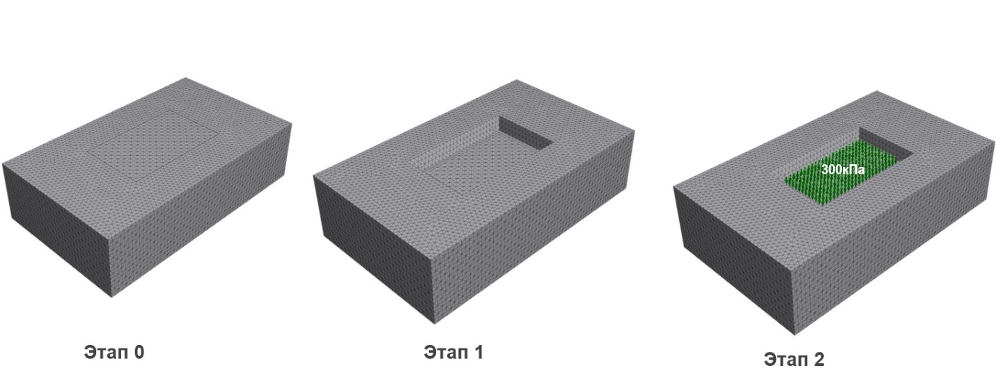 Был рассчитан также плитный фундамент с размерами плиты 16×8 м, с нагрузкой по подошве фундамента 300кПа, глубиной заложения 2 м, размерами котлована 18×10 м, характеристики грунта были приняты такими же, как и в предыдущей задаче — см. рисунок 1. Нагрузка на подошву фундамента была задана меньше расчетного сопротивления грунта для корректного сравнения численного и аналитического метода. Этапность, реализованная при численном расчете для данной задачи, представлена на рисунке 15.