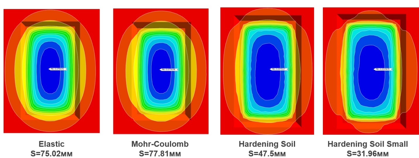 Для модели MC для сжимаемой толщи 4 м была получена осадка 16.9 мм, а для сжимаемой толщи 10 м — 23.4 мм, разница в 28%; для модели HS для сжимаемой толщи 4 м осадка составила 15.9 мм, а для сжимаемой толщи 10 м — 18.9 мм, разница в 16%; для модели HSS для сжимаемой толщи 4 м была получена осадка 14.1 мм, а для сжимаемой толщи 10 м — 15.8 мм, разница 11%.