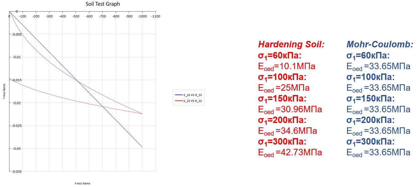 Главная причина расхождения результатов — это особенность учета жесткости грунта в разных моделях материала. Модуль деформации — это не постоянная величина, модуль деформации изменяется в зависимости от величины напряжений. На рисунке 19 представлено сравнение модели MC и HS в виртуальном одометре с помощью встроенной в midas GTS NX программы «Soil Test». К виртуальному образцу была приложена вертикальная нагрузка в 1000 кПа, а затем образец был разгружен. Синий график характеризует модель MC, а красный — HS. По синему графику видно, что модуль деформации не меняется с ростом напряжений. Для разных величин вертикального напряжения был высчитан касательный одометрический модуль деформации, и данный модуль составил 33.65 МПа при разных уровнях напряжений. Также в модели MC не учитывается модуль деформации при разгрузке и при повторном нагружении, что видно по синему графику.