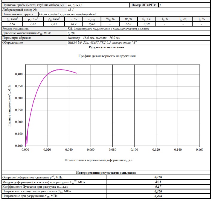 Рис. 23. Пример испытания грунта методом трехосного сжатия с определением Eur, vur. Исполнитель: Мостдоргеотрест