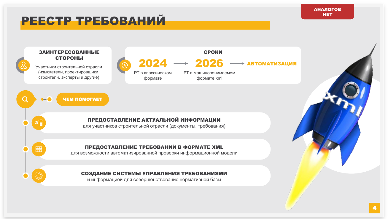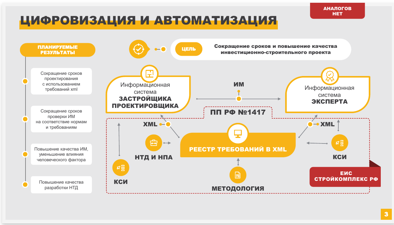 Изначально идея состояла в том, что электронный ресурс поможет проектировщикам сократить время на поиск нужной информации, не искать ее в объемных документах, быстро выявлять противоречия, дублирование, устаревшие сведения. Автоматизация проверки облегчила бы и ускорила труд сотрудников органов госэкспертизы. Согласование проходило бы быстрее, и в целом сократились бы сроки строительства, а это главная цель цифровизации строительной отрасли.
