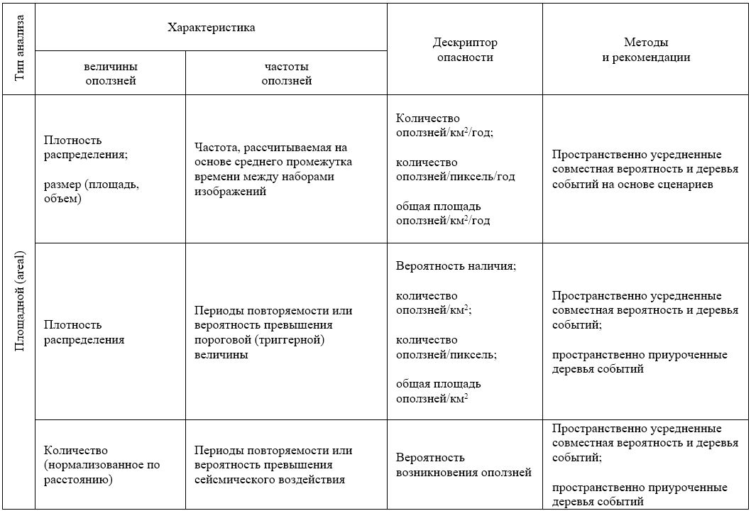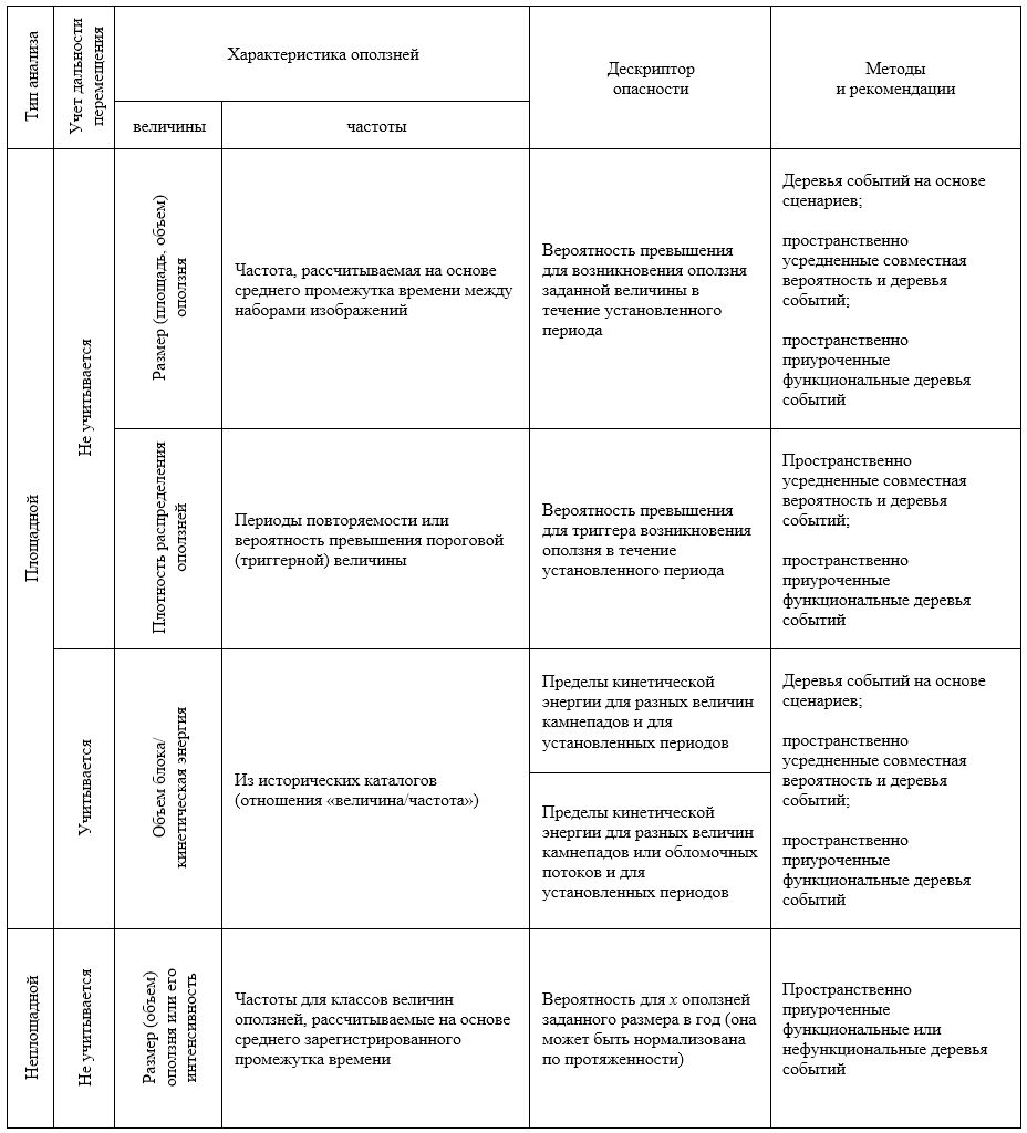 В таблицах 14 и 15 приведены предлагаемые методы оценки оползневой опасности для ее разных масштабов и типов на основе только что перечисленных категорий методов.