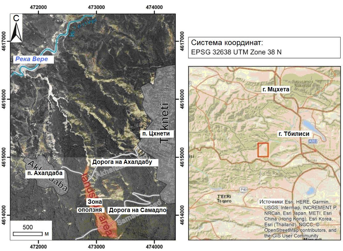 Рис. 1. Расположение зоны оползня между поселками Цхнети и Ахалдаба. Ортофотоснимок предоставлен Фондом муниципального развития