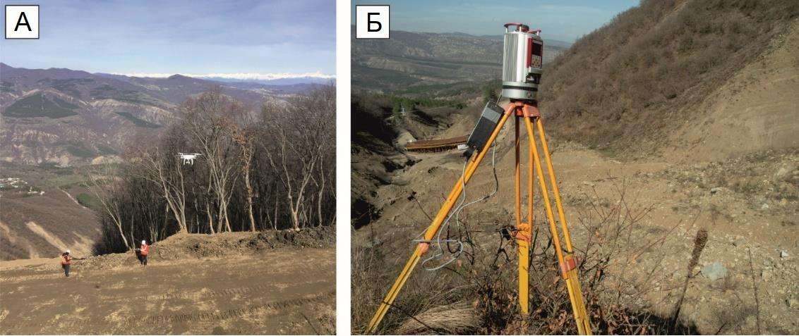 Рис. 2. Съемка с помощью беспилотного летательного аппарата (А) и наземного лазерного сканирования (Б), выполненная в исследуемой оползневой зоне в марте 2018 года