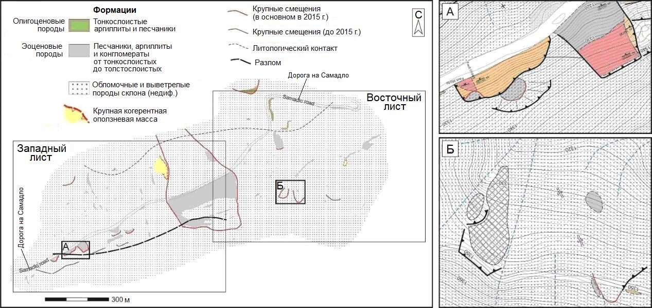 Рис. 3. Упрощенная геолого-геоморфологическая карта-схема зоны оползня (слева), основанная на картировании с высоким разрешением (справа – А, Б)