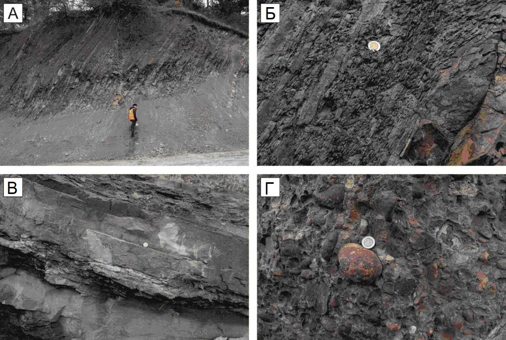 Рис. 4. Формации исследованного участка: (А) обнажение тонкослоистой формации у дороги на Самадло; (Б) контакт тонкослоистой формации с преобладающим аргиллитом; (В) песчаник толстослоистой формации; (Г) конгломерат толстослоистой формации (фото K. Кайлига)