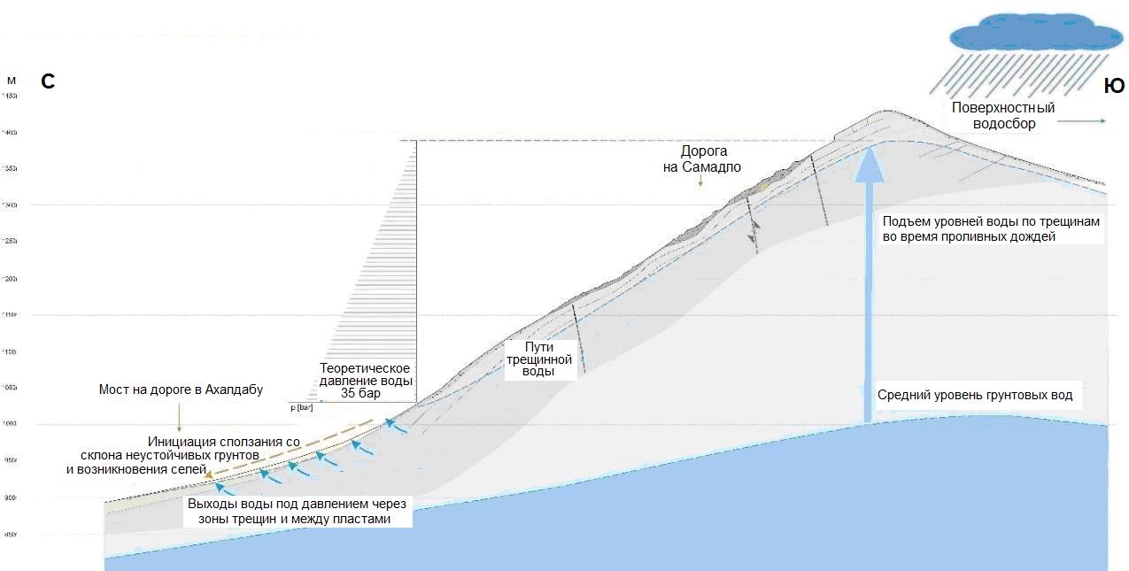 В результате выполненного картирования было получено предварительное представление о факторах и триггерных механизмах, вызывающих возникновение оползней в рассматриваемом районе (рис. 6). По предположению авторов, грунтовые воды и поровое давление явились основными факторами, вызвавшими событие 2015 года. Вероятно, уровень грунтовых вод значительно поднялся за десять дней обильных дождей, шедших перед этим. Типы напластований и трещиноватости формаций были причинами возникновения потока подземных вод, параллельного поверхности склона. При этом, возможно, присутствовавшие там прослои глин долго не давали этому потоку вытечь наружу. Поэтому в нижних частях склона могло очень сильно повыситься поровое давление, что привело к его дестабилизации вплоть до разрушения из-за взрывопододобных выходов воды в районе дороги на Ахалдабу. Затем развитие оползня продвинулось и к верхним частям склона.