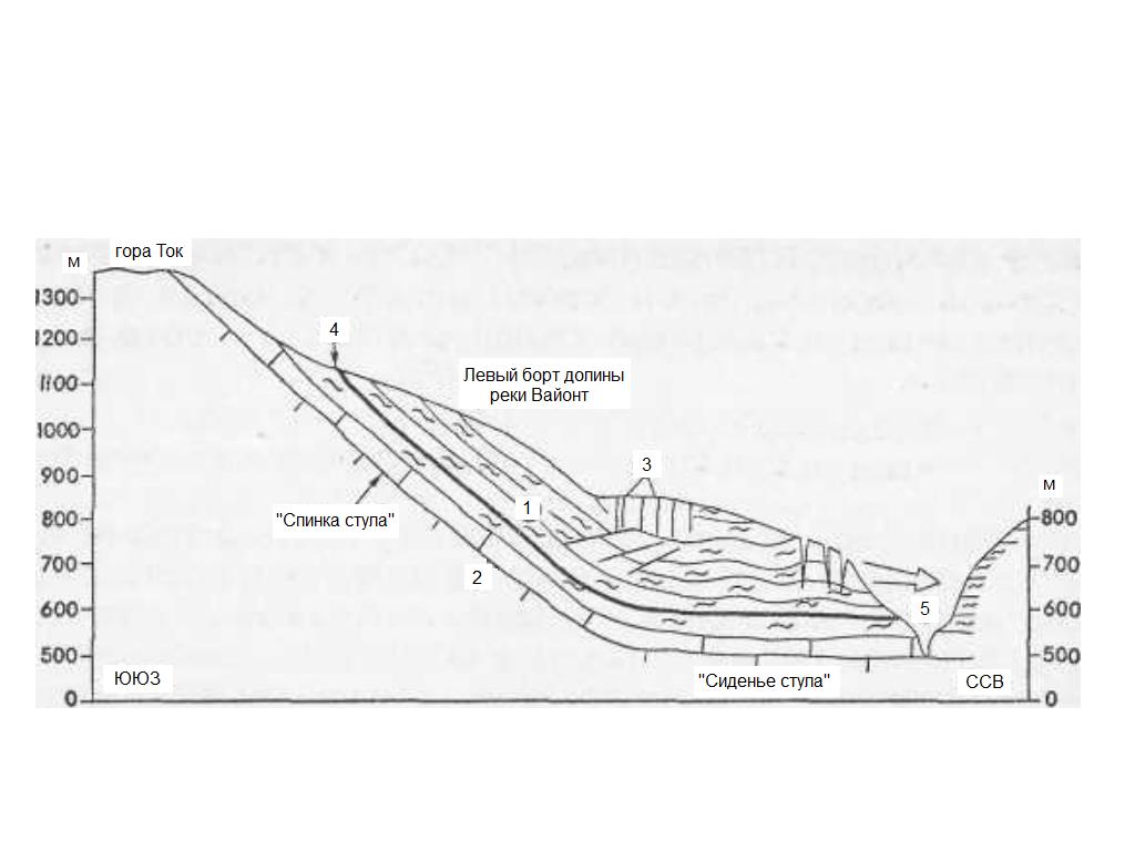 Рис. 6. Геологический разрез левого берега водохранилища Вайонт до катастрофы (по [9]): 1 – пачка мергелей и мергелистых известняков, склонных к оползанию; 2 – частично водоупорный прочный доломитизированный известняк; 3 – трещины; 4 – плоскость смещения будущего оползня с тонкими прослоями глинистых грунтов вдоль нее; 5 – ущелье реки Вайонт и чаша водохранилища; стрелка – направление движения оползня