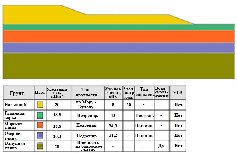 Рис. 1. Модель земляной дамбы Джеймс Бэй и свойства грунтов