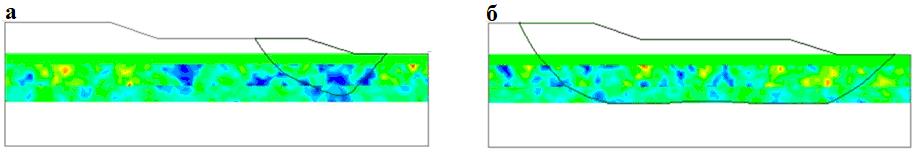 Дальнейшая верификация этих результатов показана на рисунке 4. Распределение прочности грунта на сдвиг показано различными цветами для короткой и более длинной поверхности скольжения. Обе поверхности разрушения проходят через самые слабые материалы (синие области) (см. рис. 4).