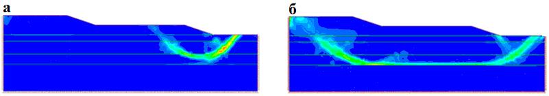Рис. 5. Результаты анализа методом снижения прочности на сдвиг (SSR) для двух пространственных полей: а – короткого (коэффициент снижения прочности на сдвиг SRF = 0,9); б – длинного (SRF = 1,05)