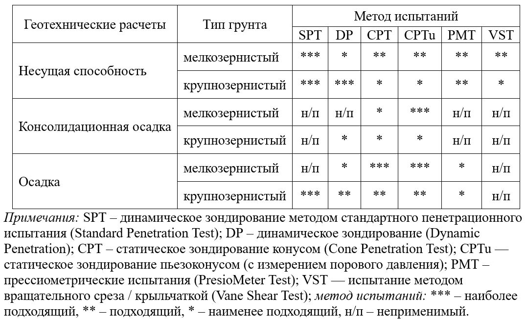 Таблица 1. Предлагаемые методы полевых испытаний для проектирования отдельных фундаментов мелкого заложения [5]