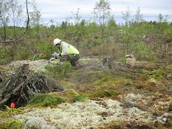 Мы проводили опробование почвы, компонентов лесной подстилки, например, хвои, опавших листьев, мхов, лишайников, листьев брусники и можжевельника. Причем по нормативным документам для подготовки одной пробы на содержание радионуклидов необходимо использовать до 10 килограммов сухого материала. Представляете себе, например, 10 килограммов сухого мха или лишайника? Это все собиралось в огромные мешки и транспортировалось в лаборатории.