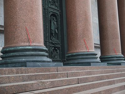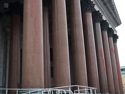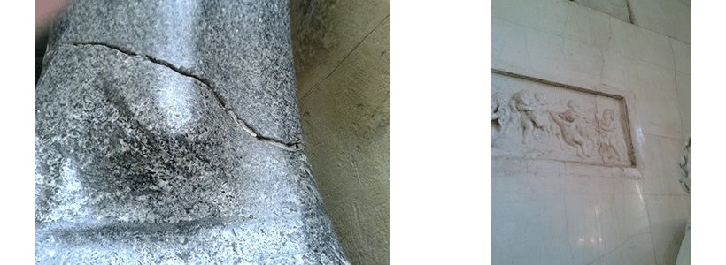 Рис. 9а Развитие трещин в колоннах портиков собора: трещины слабонаклонные на западном портике Рис. 9б Развитие трещин в колоннах портиков собора: трещины слабонаклонные на западном портике