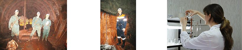 Рис. 11. Специализированная съемка (а), отбор проб (б) и их изучение в лаборатории (в) (Яковлевское месторождение БЖР, КМА)