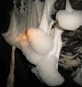 Рис. 12. Инженерно-геологические и микробиологические исследования в подземных выработках Яковлевского рудника (Яковлевское месторождение БЖР КМА): Плесневые грибы на крепи у рудоспуска №23, гор. -370; Микробная слизь на стенке грузового квершлага, ПК74+5м, гор. -425 м (б); Белая плесень на стенке Рудничный штрек №7, 11 ЛО, гор. -425 м (в)