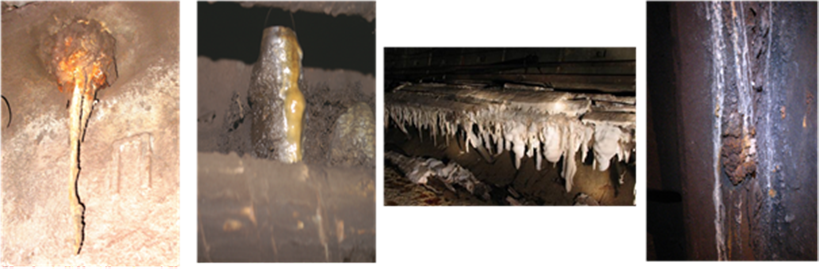 Рис.13. Различные натечные формы на железобетонных обделках в перегонных тоннелях Петербургского метрополитена