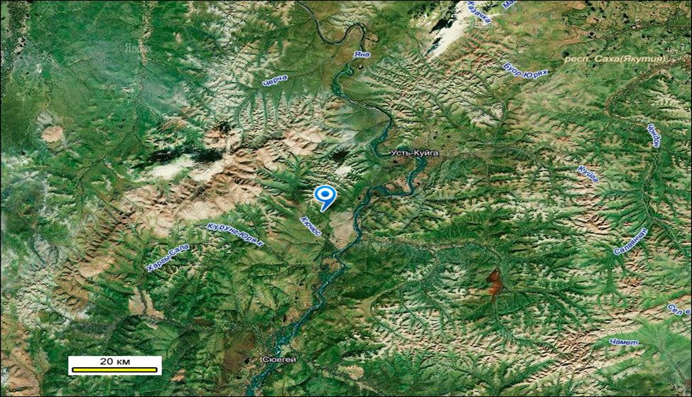 Кючусское месторождение находится за Полярным кругом, на границе Верхоянского и Усть-Янского районов Республики Саха (Якутия), в нижнем течении реки Кючус – левого притока реки Яна (рис. 1). Расстояние до речного порта Усть-Куйга на реке Яна составляет 50 километров, до районного центра – пос. Батагай, где находится речной порт и аэропорт – 340 километров по автозимнику.