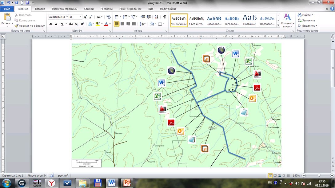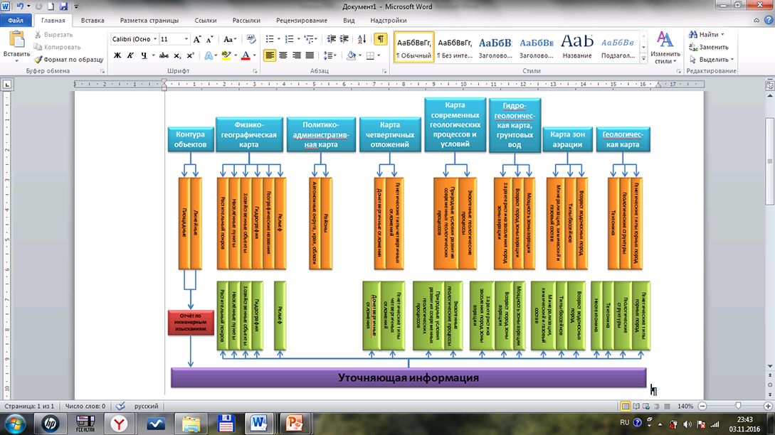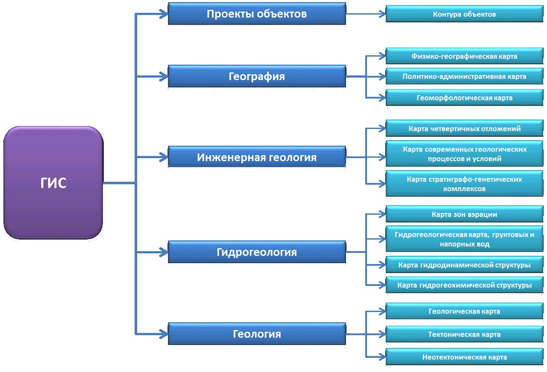 Созданная геоинформационная система для предприятия, имеющего значительные объёмы архивов, становится удобным инструментом быстрого поиска необходимой информации. Идея привязки проектируемого объекта к истинному географическому положению, что даёт возможность быстро находить в архиве необходимые отчёты по инженерным изысканиям, сама по себе не нова. Давно существует возможность при помощи геоинформационной системы планировать полевые работы (выбирать подъезды, расставлять горные выработки и т.д.). В зависимости от внесённой в базу данных информации можно проводить предварительный анализ. Например, внося информацию о физико-географических условиях наличия геологических процессов и геологии в целом (базовая цифровая модель местности — электронная географическая карта, цифровая модель четвертичных отложений, цифровая модель проявления экзогенных геологических процессов, цифровая геологическая модель дочетвертичных отложений, цифровая модель проявления эндогенных геологических процессов и т.д.), возможно создать банк данных, который позволит структурировать материалы на модели, отражающей географию, геоморфологию и геологию (рис. 1).
