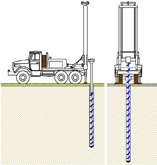 1. По контуру котлована с использованием полых шнеков диаметром 200–250 мм производится бурение вертикальных скважин с шагом 1200–1500 мм на проектную глубину котлована плюс 2–3 м или более (в зависимости от глубины залегания водоупорного слоя) с последующим заполнением этих скважин глинистым раствором (рис. 2).