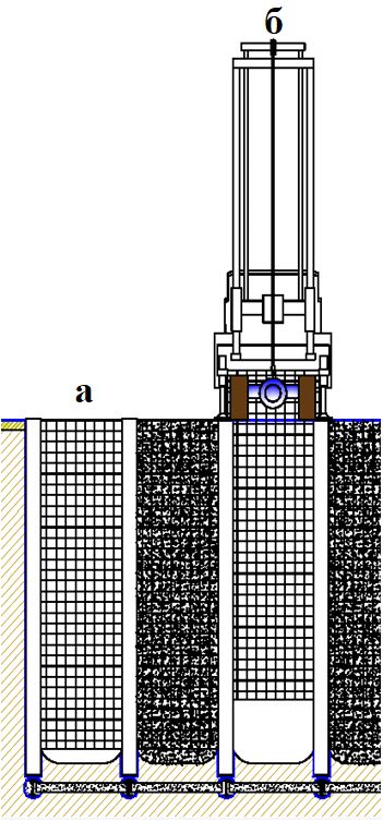 2. В каждую скважину до проектной отметки опускается с задавливанием двутавровая балка (или балка с более сложным профилем) размером в поперечнике 200–250 мм (рис. 3, а).