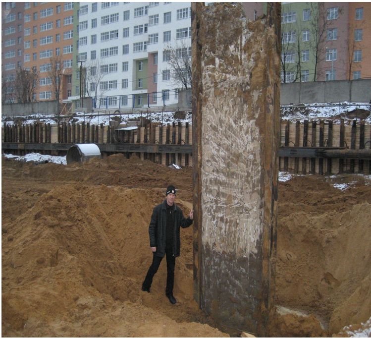 Строительство этого котлована осуществлялось одним из традиционных способов – с созданием шпунтового ограждения, выемкой грунта с забиркой до уровня грунтовых вод и последующим длительным водопонижением и откопкой до проектной отметки. Однако в геологических условиях Ходынского поля имелась возможность отсечь водоносный горизонт противофильтрационной диафрагмой. В этом случае использование метода узких прорезей в грунте исключало бы водопонижение, в результате чего сократились бы сроки строительства, а также существенно уменьшились бы расходы на материалы и стоимость работ. Фотография пробной секции возможного ограждения котлована между двумя двутавровыми балками, которая была создана методом узкой прорези в грунте и затем откопана, представлена на рисунке 5.