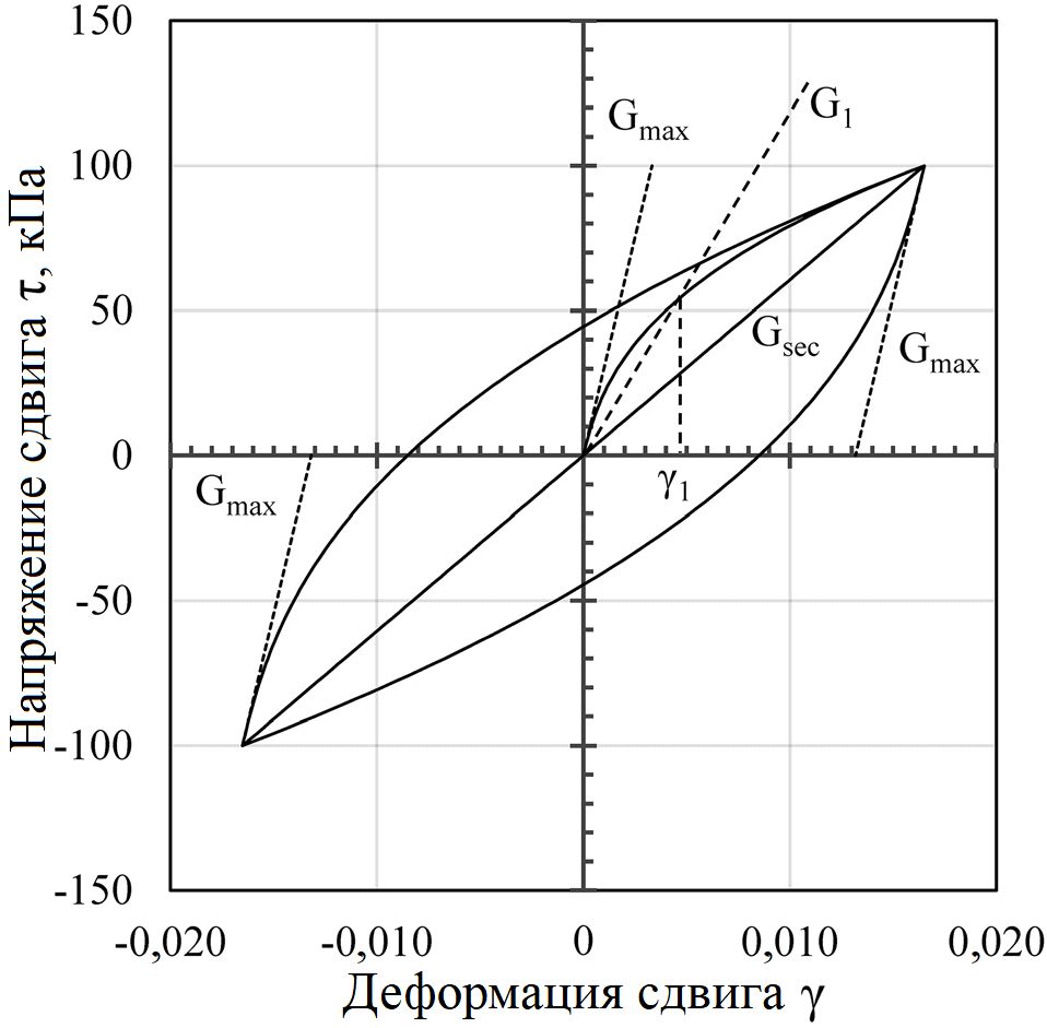 Вучетич и Добри [7] и Ишихара [8] определили пороговую объемную деформацию сдвига в условиях циклического нагружения (γtv), при превышении которой идет постоянное необратимое изменение микроструктуры и жесткости дисперсного грунта. Кроме того, модуль сдвига уменьшается по мере увеличения амплитуды деформации сдвига и поведение грунта становится нелинейным. На данном этапе для описания этого свойства обычно используется кривая уменьшения (деградации) модуля сдвига, что важно для анализа различных динамических задач, в которых деформации имеют большие амплитуды (например, при сильных движениях грунта во время землетрясений). Кривая деградации модуля сдвига может быть получена по результатам испытания на крутильный сдвиг (TOSS), при котором генерируются петли гистерезиса на кривой «напряжение – деформация». По последним вычисляются значения секущего модуля сдвига Gsec при увеличении уровня деформации (рис. 1).