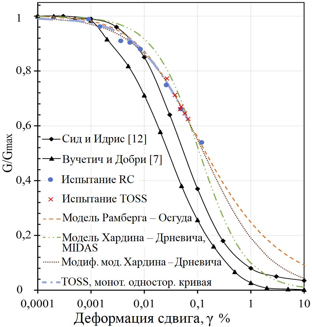 Были проанализированы результаты испытаний на резонансной колонке (RC) и на чистый сдвиг при кручении (TOSS). Они были использованы в качестве эталонных для оценки способности моделей грунта Рамберга – Осгуда и Хардина – Дрневича прогнозировать кривые «напряжение – деформация» при указанных типах сдвиговых нагрузок.