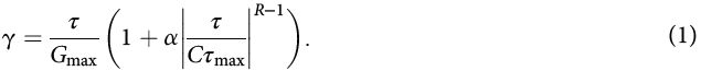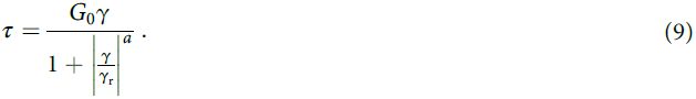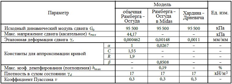 Рамберг и Осгуд [13] предложили модель с тремя параметрами для описания кривых «напряжение – деформация» для листов (пластин) из алюминиевого сплава, нержавеющей стали и углеродистой стали. Фаччоли и др. [14] использовали ее для моделирования поведения дисперсного грунта с целью прогнозирования кривой деградации модулей сдвига песков. Формула, описывающая нелинейное поведение «напряжение – деформация», для использования в практических расчетах для дисперсных грунтов имеет следующий вид: