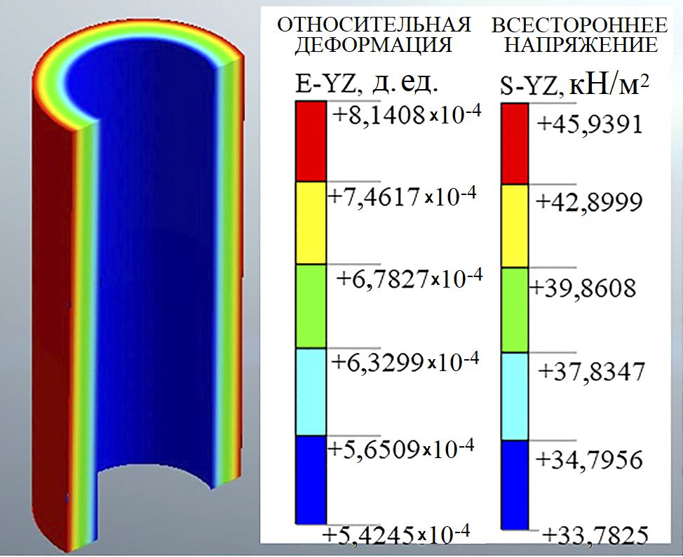 Эта модель состоит из 2017 элементов, она закреплена на нижней поверхности, а все верхние узлы связаны жесткими связями с центральным узлом, который может перемещаться вдоль вертикальной оси и вращаться вокруг нее. Этому центральному узлу предписывается вращение (или момент), что должно имитировать крутильную нагрузку, приложенную при испытании TOSS. Никаких неравномерностей в напряжениях в основании модели после стадии предварительного трехосного сжатия не было замечено.