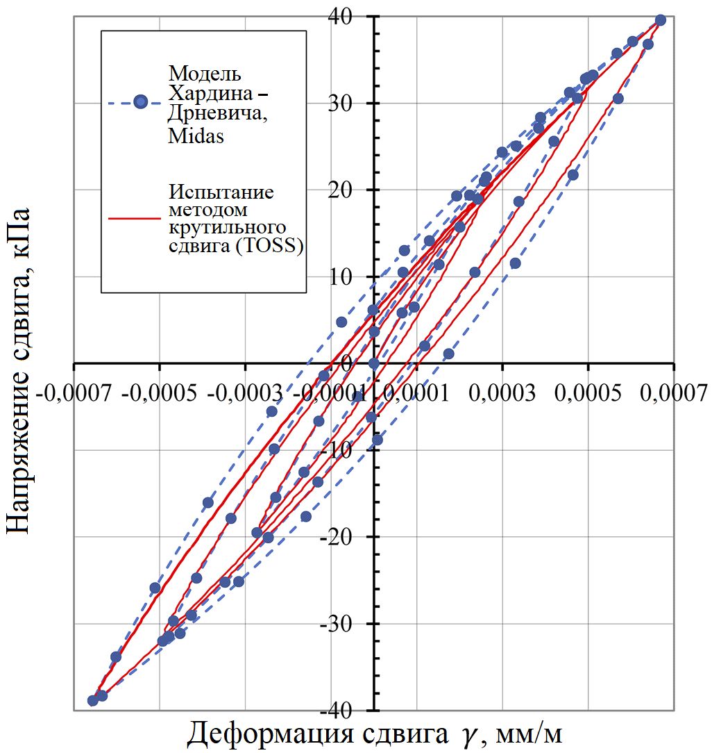 Было выполнено только одно испытание при неравномерном нагружении методом крутильного сдвига (TOSS) при напряжении сдвига 40 кПа для оценки способности моделей материалов предсказывать динамическое поведение дисперсного грунта. История неравномерного нагружения была масштабирована так, чтобы получить максимальное значение напряжения сдвига 40 кПа для этого TOSS с контролируемым напряжением. Полученная зависимость «напряжение – деформация» использовалась для аппроксимации (fitting) соответствующей кривой и калибровки модели. Величины модуля сдвига по данным испытания TOSS были получены по монотонной односторонней (однонаправленной) кривой, а также по значениям секущего модуля сдвига Gsec (наклонам линий, соединяющих два конца каждой из петель).