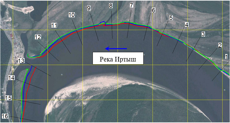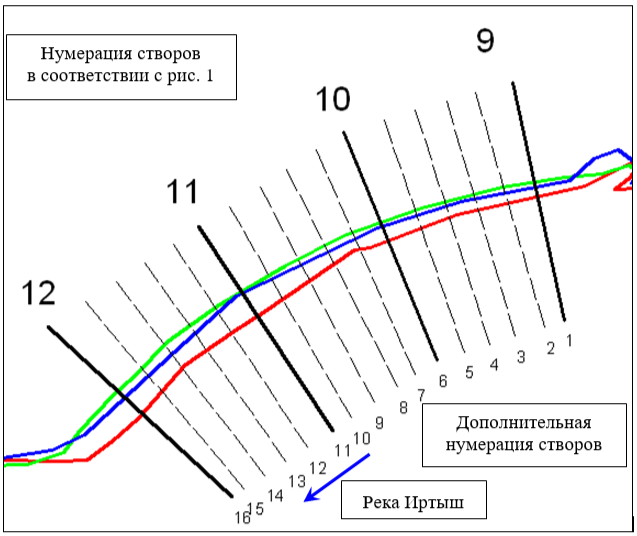 По длине рассматриваемого участка можно выделить несколько характерных зон. На этих участках наблюдаются как различные скорости плановых размывов, так и разная вариативность этих скоростей. Поэтому на участке длиной 4 км, расположенном в вершине излучины реки Иртыш, выделен относительно короткий участок длиной 750 м – от створа №9 до створа №12. На этом участке были установлены дополнительные поперечники с расстоянием 50 м между ними. Всего было рассмотрено 16 участков.