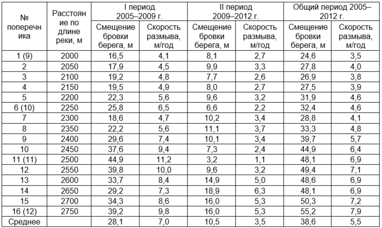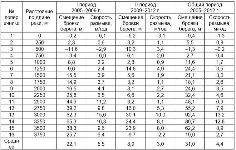 На некоторых поперечниках (№№1, 3, 4, 16) отмечены отрицательные скорости смещения берега, то есть, берег не размывался, а смещался в сторону реки (см. примечание к табл. 1). Чем это вызвано, на данный момент не ясно – фактическим намывом берега, неточностью исходных материалов или неточностью наложения космических снимков. Тем не менее, далее анализ полученных материалов выполнен с полученными значениями, включающими и отрицательные значения.