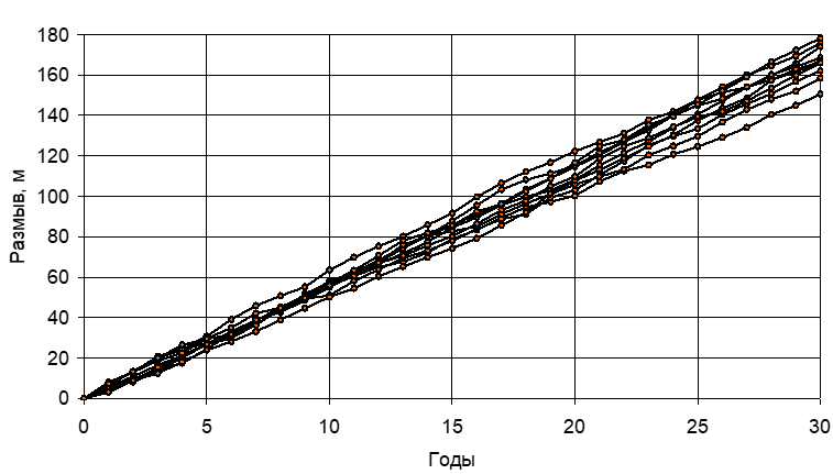 Как видно, результирующее смещение берега за расчетный период 30 лет может находиться, как минимум, в диапазоне от 151 м до 178 м. Соответственно, средняя скорость при 10 модельных реализациях размыва составляет от 5,0 м/год до 5,9 м/год.